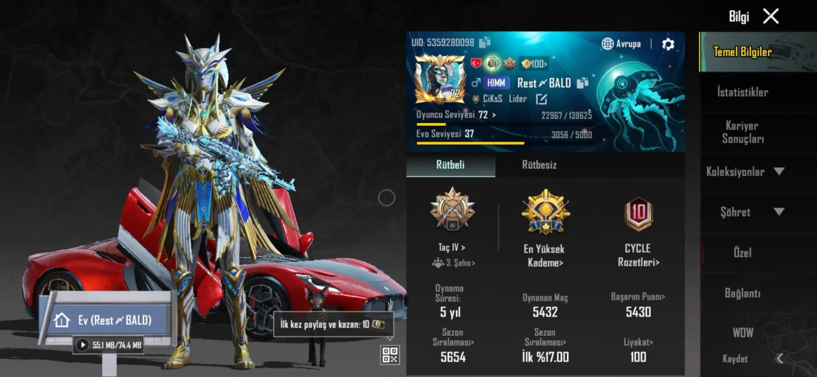 hesapta 48 nihai 400 destansı kuzgun hariç tüm xsuitler + 2 +3 firavun +7 seviye 72 silah m7 m4 akm m24 ump ace +7 seviye vs. kalan birçoğu ölüm duyurulu hesapta birçok nadir öğe mevcut 30 küsür araç spor arabalar mevcut mumyalar vs vs anlayacağız full+full hesaptır ilk sahibinden
